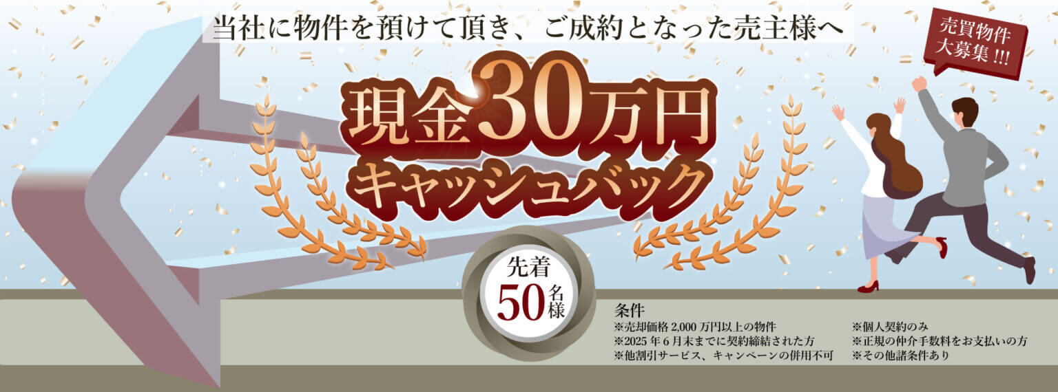 期間中、弊社に物件を預けて頂き、成約となった売主様に30万円のキャッシュバックをいたします。