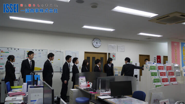 試合見学の後は、弊社水戸駅南支店の店舗見学へ。内定者の方たちは先輩社員から普段の仕事や店舗内のレイアウトについて、丁寧な説明を受けていました。