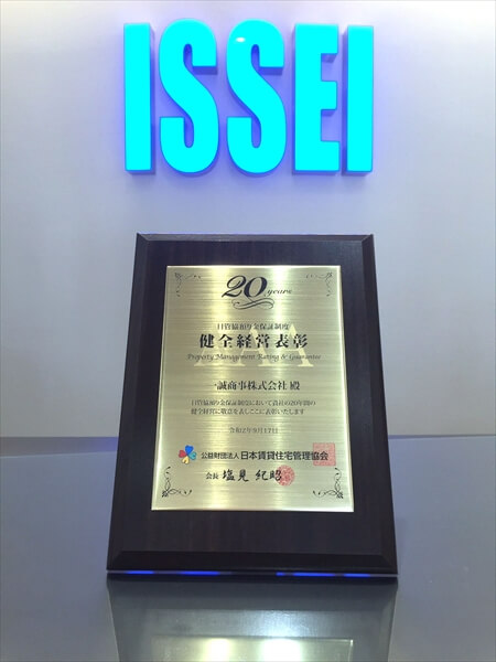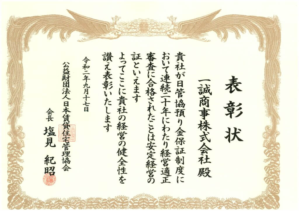 一誠商事株式会社(代表取締役:五十嵐 徹、本社:茨城県つくば市竹園)は、2020年11月公益社団法人日本賃貸住宅管理協会「日管協預かり金保証制度」において20年間継続して加入審査を通過し、その経営の健全性を讃えられ表彰を受けましたのでお知らせします。一誠商事では、今後とも、安定経営に努めてまいります。