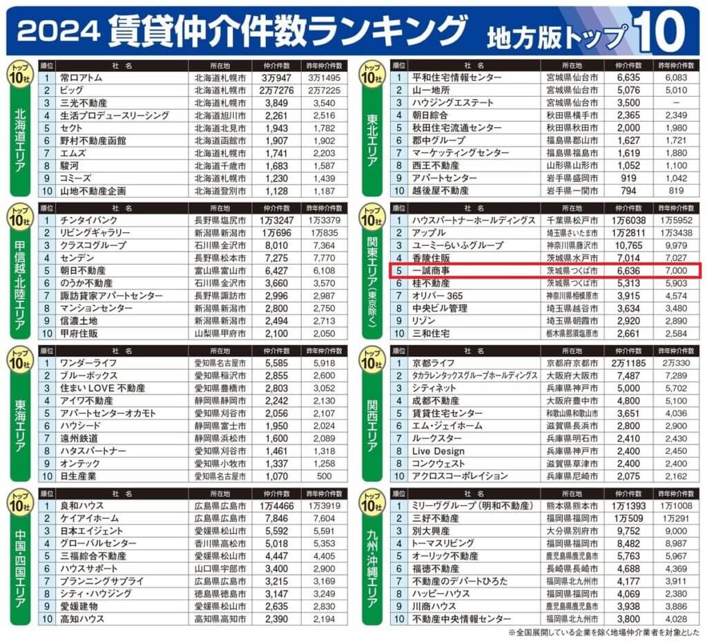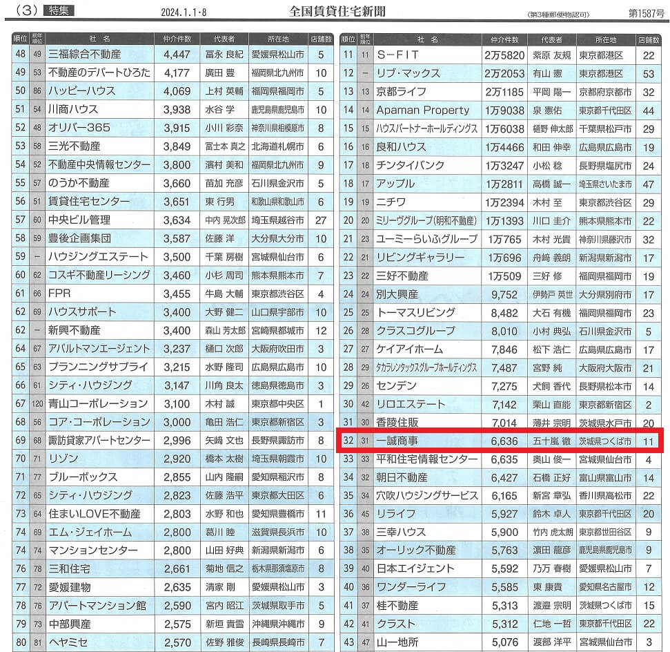 全国賃貸住宅新聞の「2024賃貸仲介件数ランキング」、「2024賃貸仲介件数ランキング 地方版トップ10」に掲載されました。