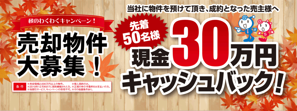 期間中、当社に物件を預けて頂き、成約となった売り主様に30万円のキャッシュバックをいたします。