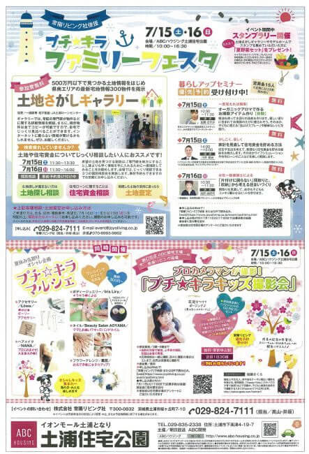 7/15・16、土浦住宅公園で行われる「プチ★キラファミリーフェスタ」内で実施される土地さがしギャラリーに一誠商事が参加します。
