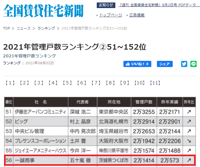 全国賃貸住宅新聞7月26日号にて、全国の管理戸数ランキングが発表されました。