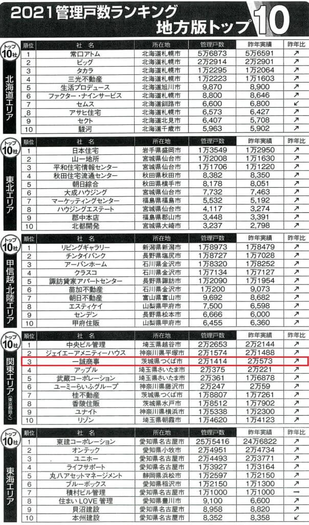 一誠商事は全国1063社の不動産会社のうち56位にランクインし、昨年の59位より順位を上げました。