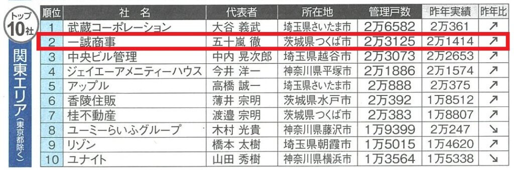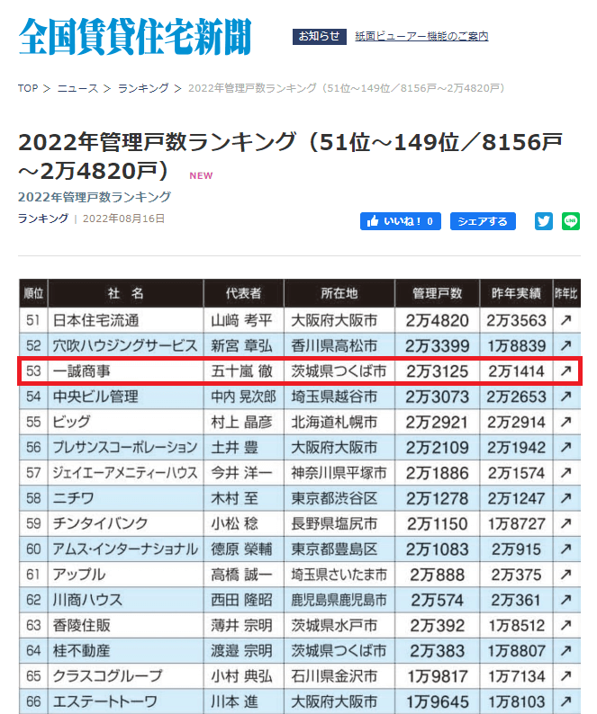 一誠商事は全国1083社の不動産会社のうち53位にランクインし、一昨年59位、昨年56位と年々順位を上げています。