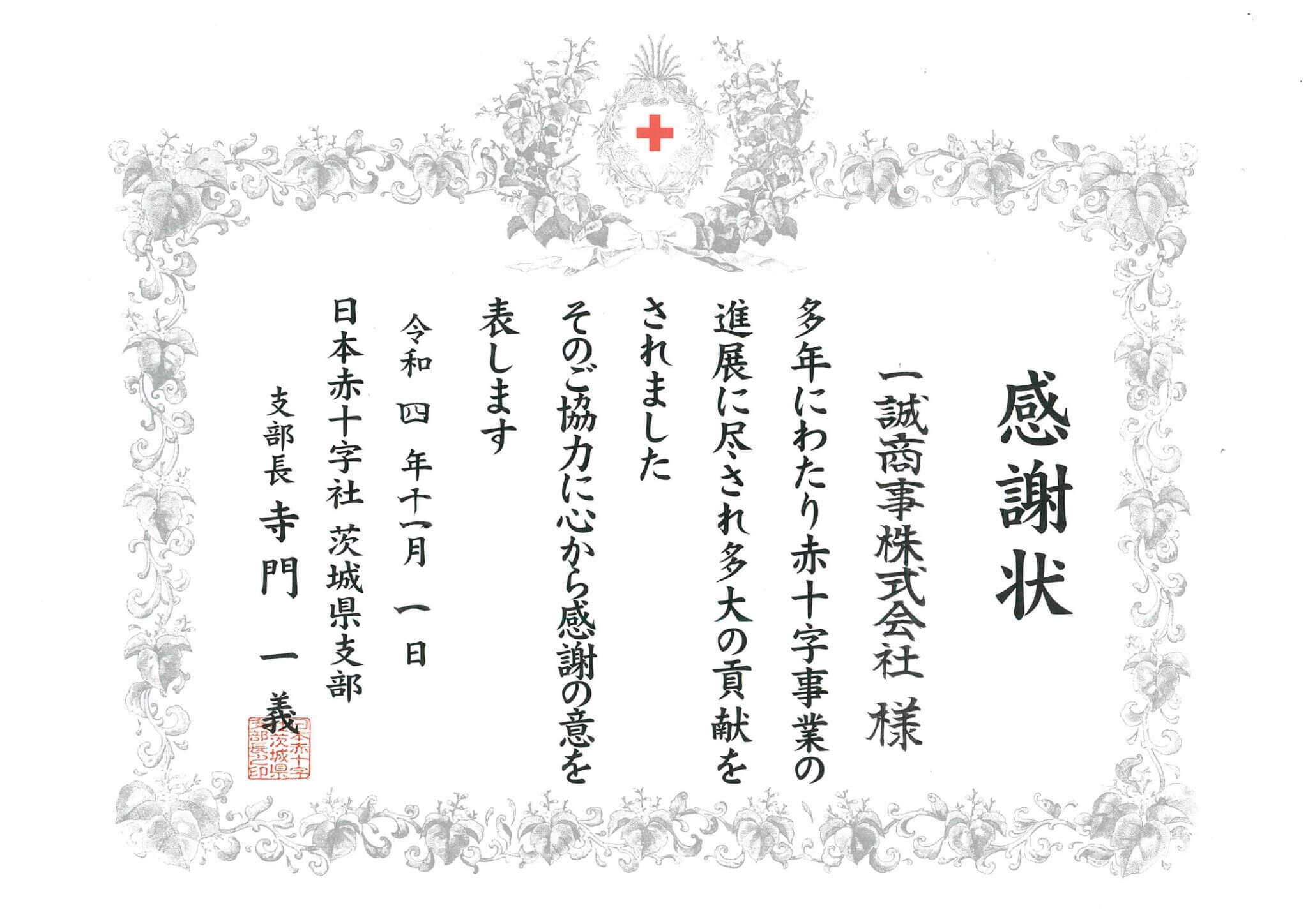 一誠商事株式会社(代表取締役:五十嵐 徹、本社:茨城県つくば市竹園)は、2022年11月日本赤十字社茨城県支部より、5年を超えて協力している企業として表彰を受けましたのでお知らせします。