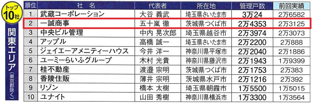 全国賃貸住宅新聞8月7日号にて、全国の管理戸数ランキングが発表され、一誠商事は全国1093社の不動産会社のうち55位にランクインしました。