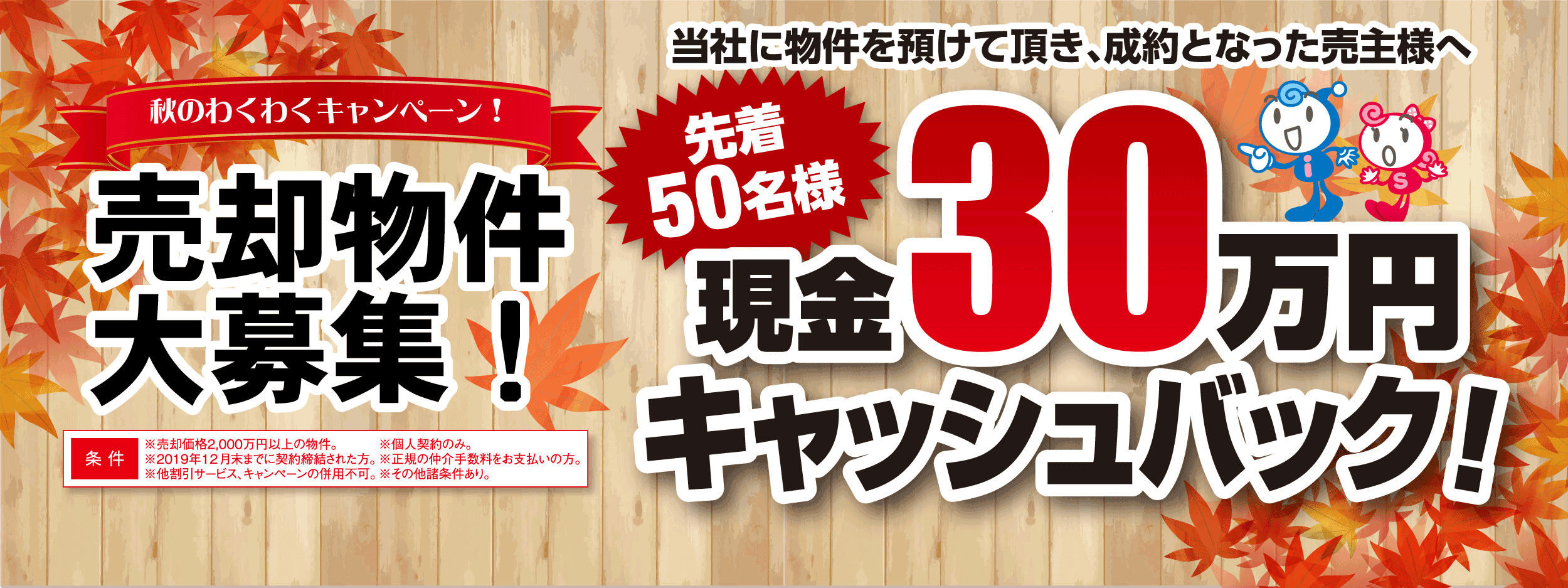 期間中、当社に物件を預けて頂き、成約となった売り主様に30万円のキャッシュバックをいたします。