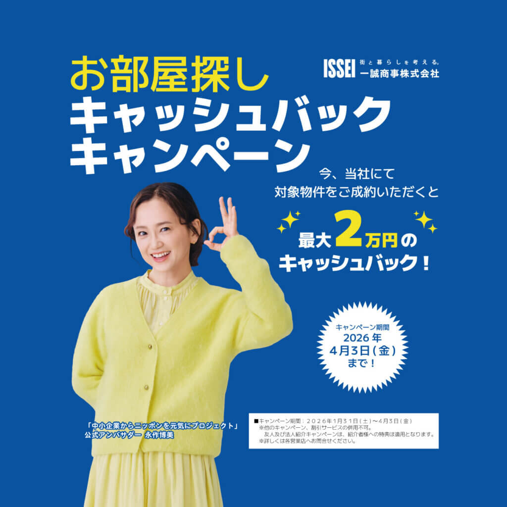 期間中、一誠商事にて対象物件をご成約いただくと最大2万円のキャッシュバックをいたします。