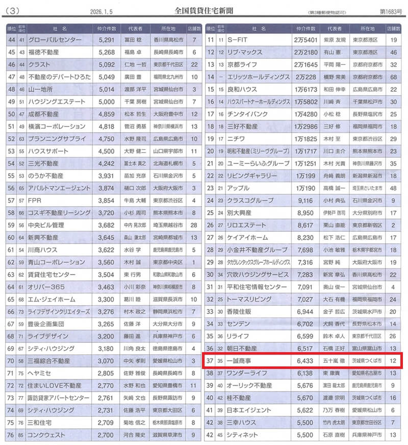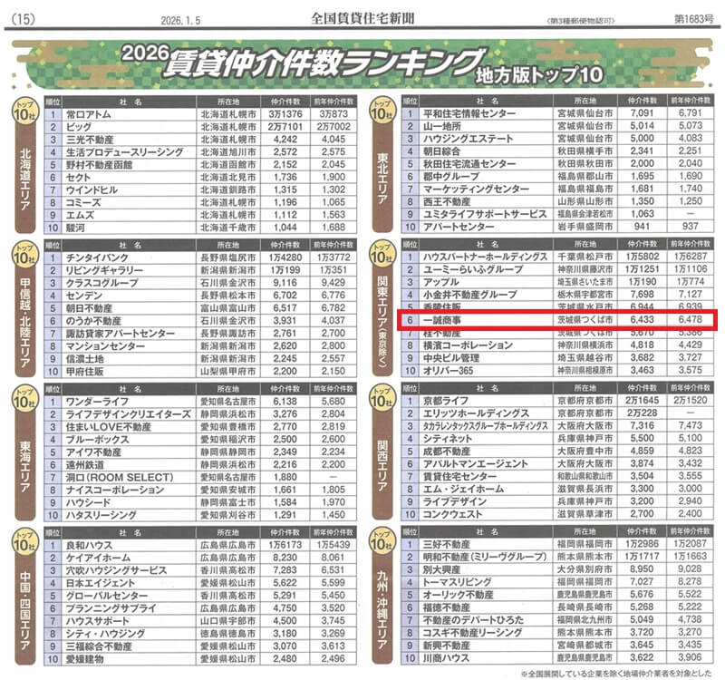 このたび、全国賃貸住宅新聞 2026年1月5日号 に掲載された「2026 賃貸仲介件数ランキング 371社」および「2026 賃貸仲介件数ランキング 地方版トップ10」において、以下の順位を獲得いたしました。