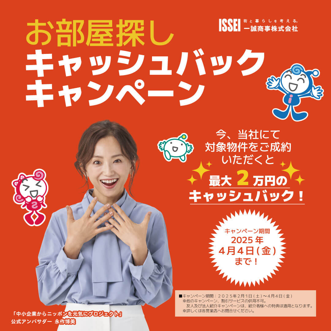期間中、一誠商事にて対象物件をご成約いただくと最大2万円のキャッシュバックをいたします。