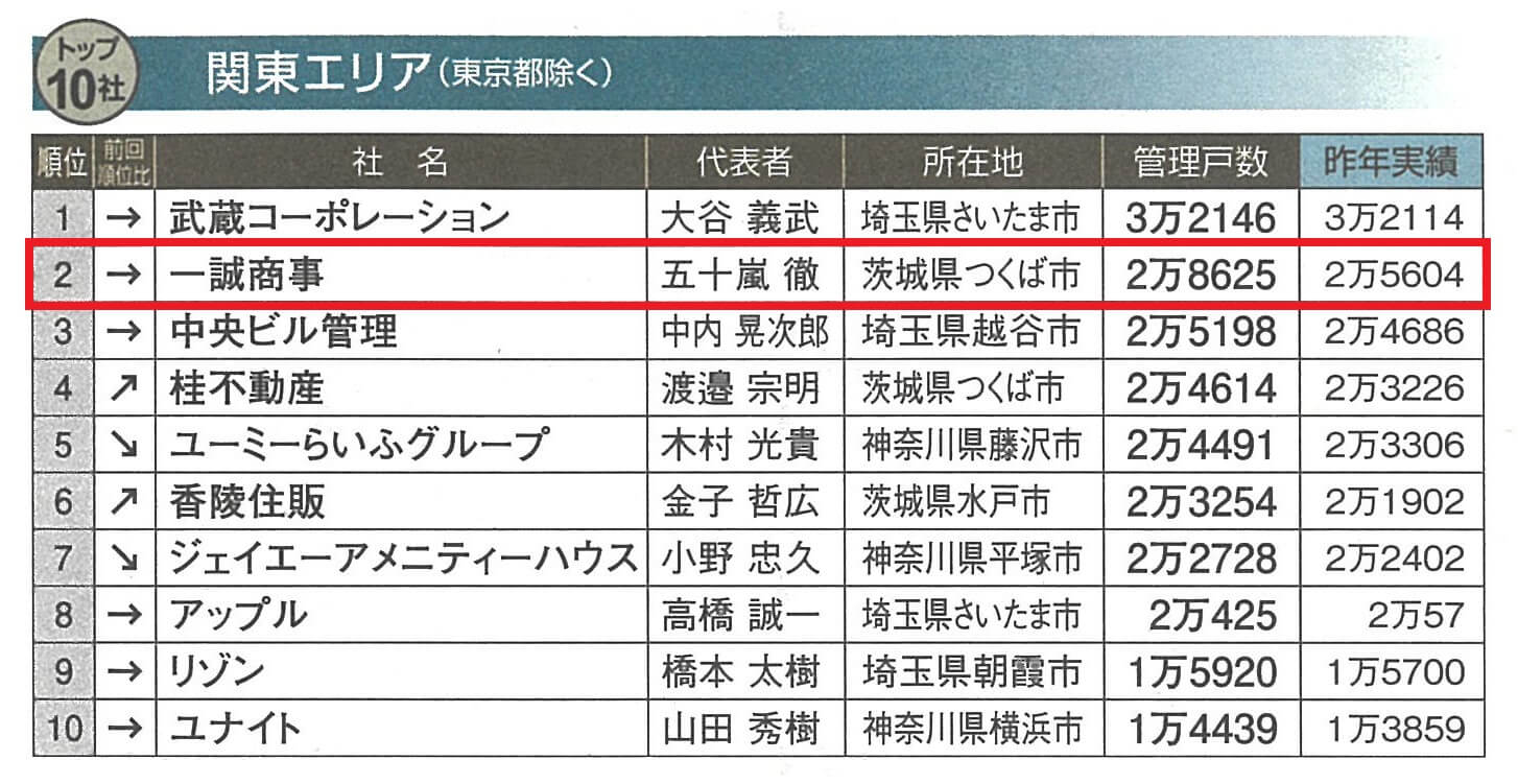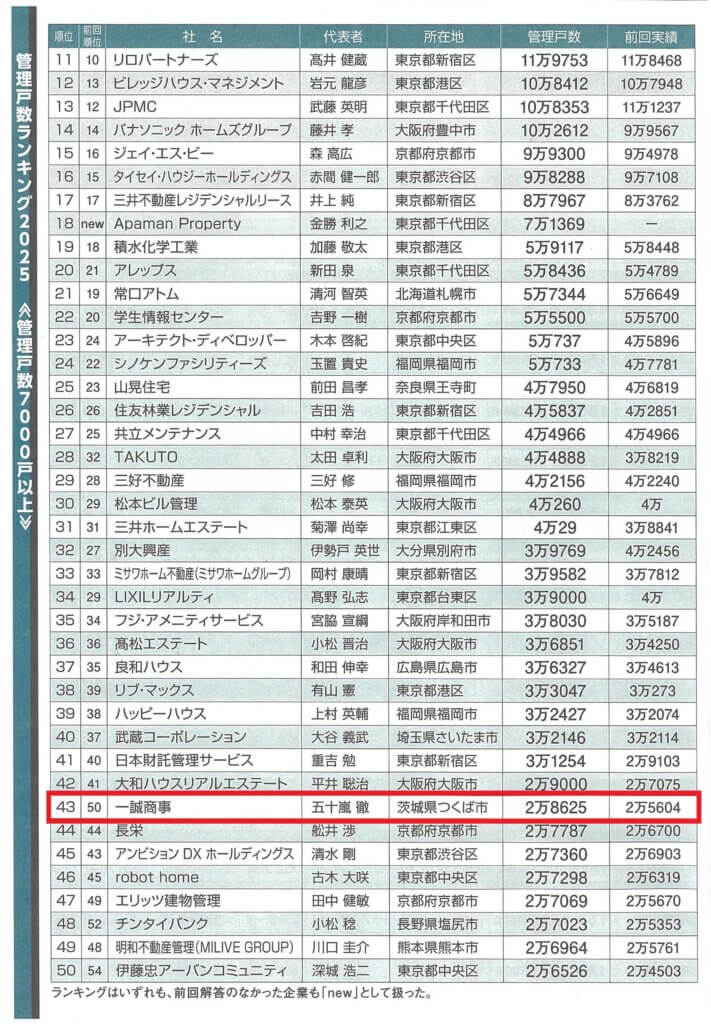 全国賃貸住宅新聞8月4日号にて、全国の2025年度管理戸数ランキングが発表され、一誠商事は全国1085社の不動産会社のうち43位にランクインしました。