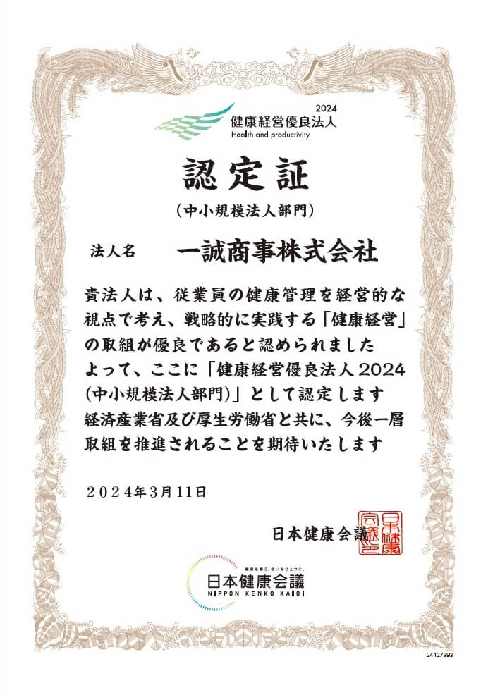 2024年3月11日、当社は「健康経営優良法人2024(中小規模法人部門)」に認定されました。