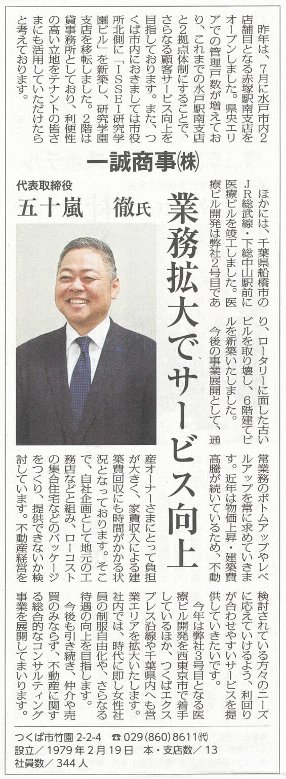弊社代表・五十嵐徹のインタビューが、以下の媒体に掲載されました。媒体名:茨城新聞発行日:2025年 1月 8日見出し:「トップが語る2025」WEB版:https://sales.ibarakinews.jp/?p=4526