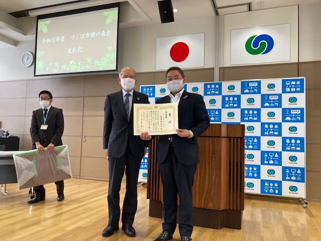 この表彰は「みどり」を用いて快適で地球に優しい生活環境の創出を推進する事を目的に実施されており、緑化及び清掃活動などを通じて、公園などの公共施設の保全及び景観の向上に取り組み、地域の環境や社会に貢献している企業として一誠商事が表彰されました。