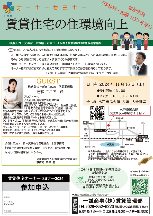 11/16(土)水戸市民会館にて、公益財団法人日本賃貸住宅管理協会(日管協) 茨城県支部主催のオーナーセミナーを開催いたします。