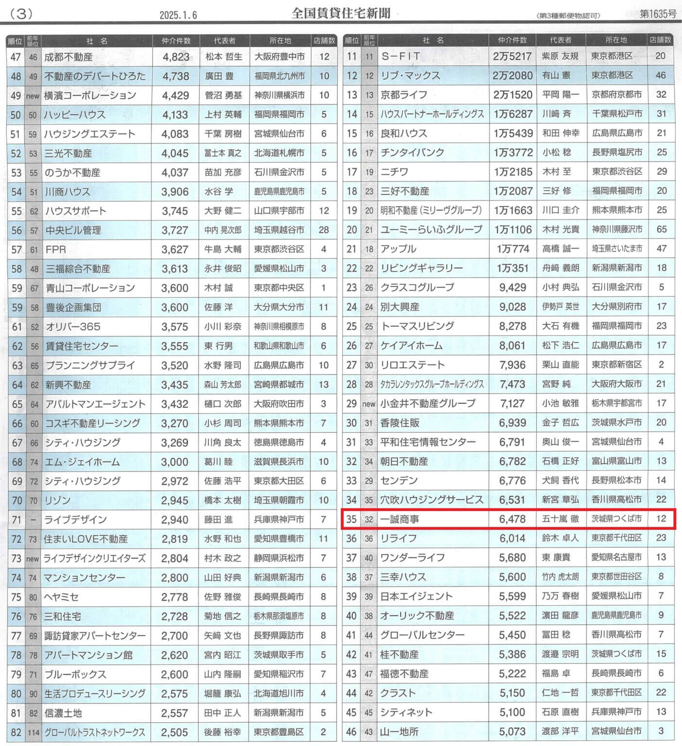 全国賃貸住宅新聞の「2025賃貸仲介件数ランキング400社」「2025賃貸仲介件数ランキング地方版トップ10」に掲載されました。