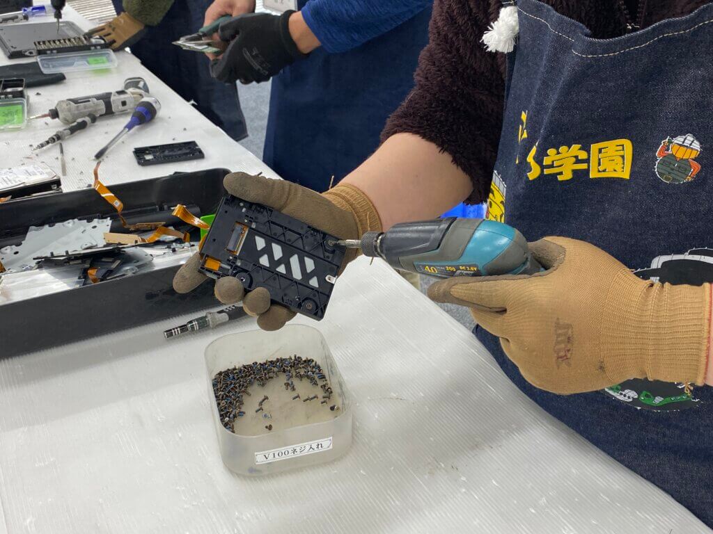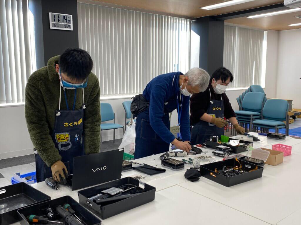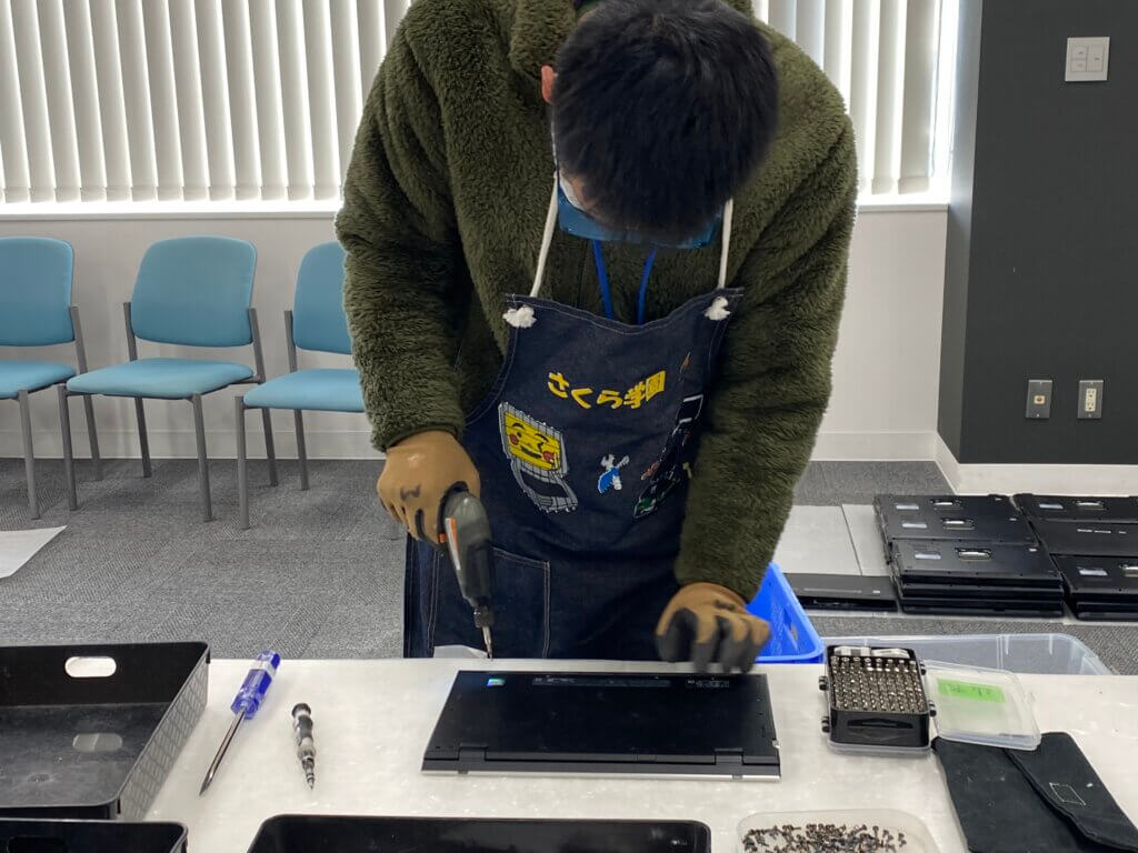 当日は、さくら学園の職員および作業担当者の方々が弊社へ来社され、セキュリティ確保のためその場で記憶装置の取り外しと物理的破壊を実施。職員の方と作業担当の方、計3名が安全装備を整え、一台一台、慎重に作業を進めていく姿が大変印象的でした。