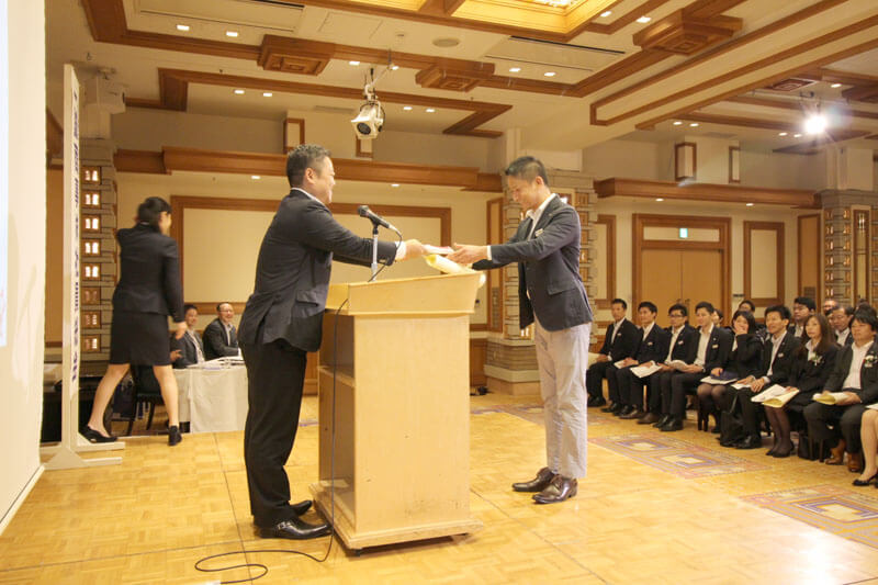 永年勤続表彰や目標を達成した社員への表彰を行い、また、今年度の目標に対する各店舗の決意表明を発表しました。