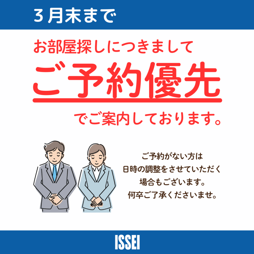 お部屋探しにつきましては、3月末日まで、ご予約優先でご案内しております。